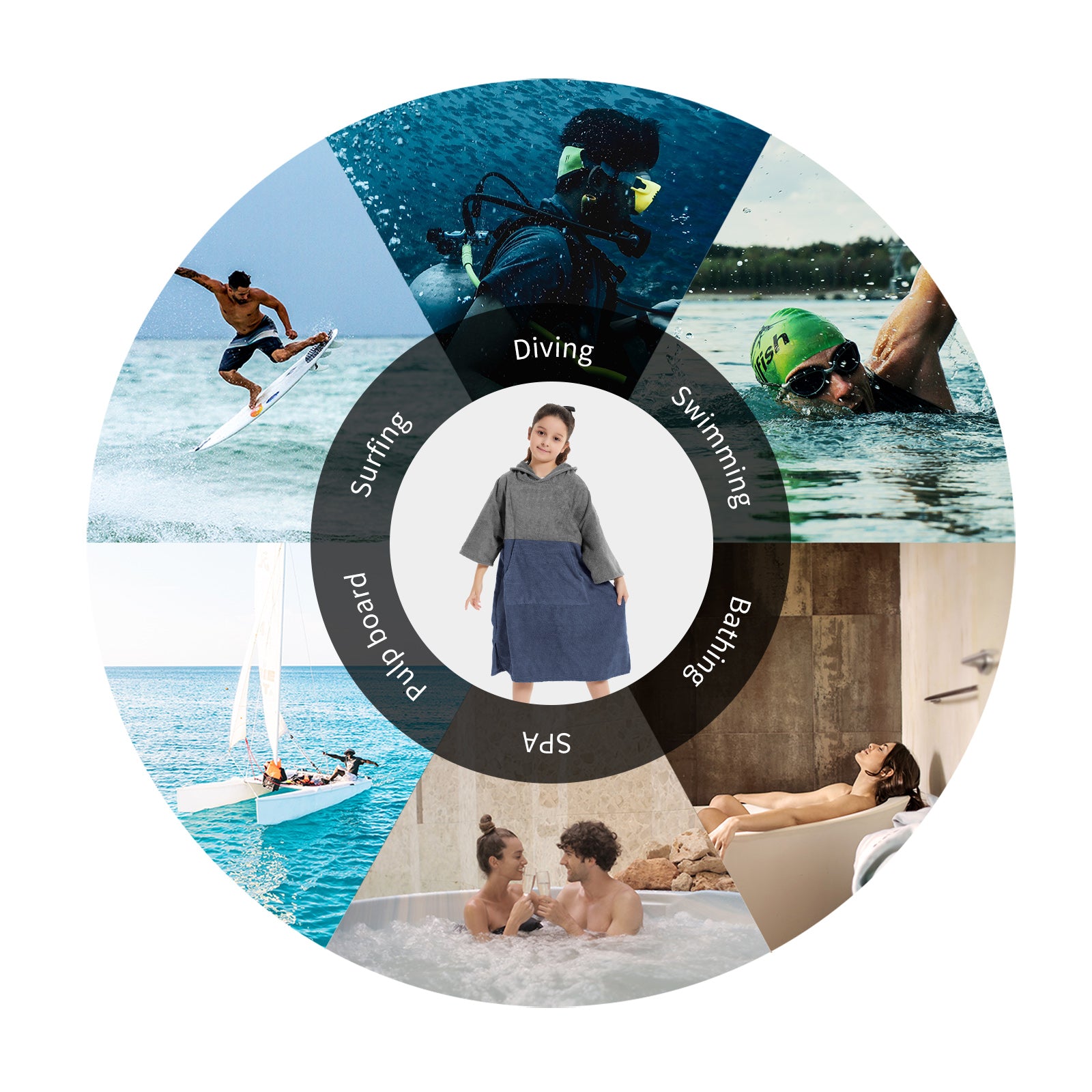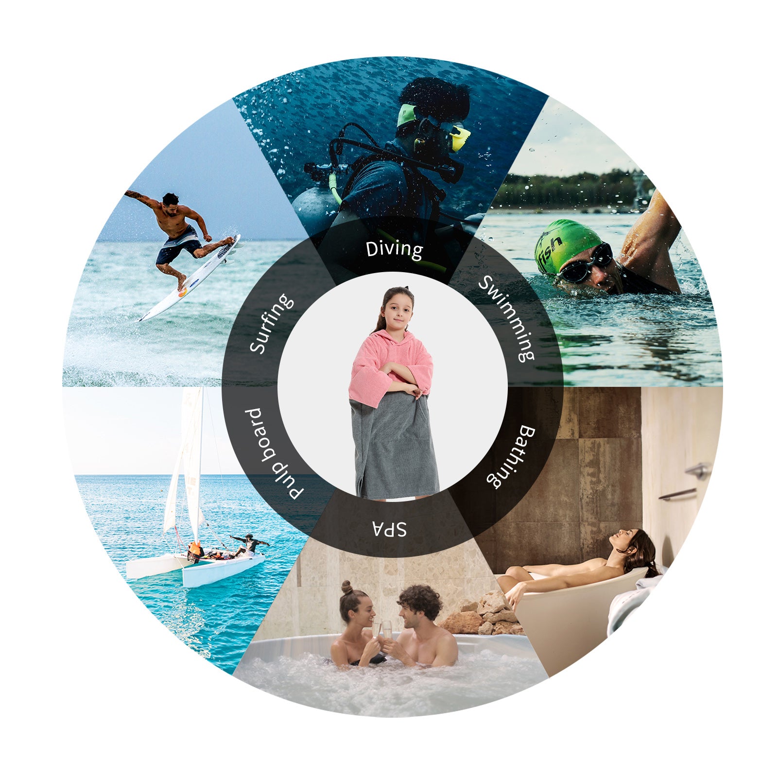 - WIDE APPLICATIONS: The hood and pocket design add functionality for wind protection and storage. This swim towel is a must-have item for beach-changing clothes, widely used in water sports and home bathing.